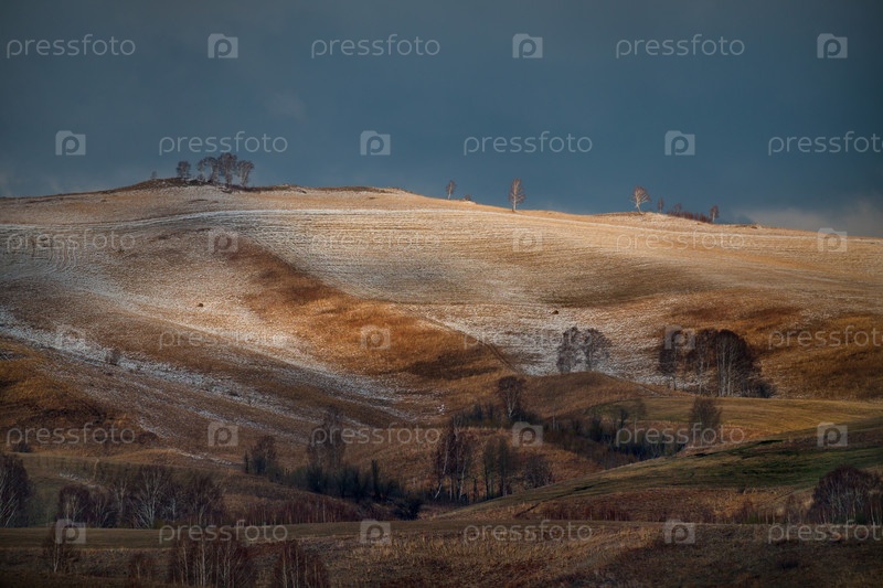 Россия, Горный Алтай. Припорошенные последним снегом холмистые поля