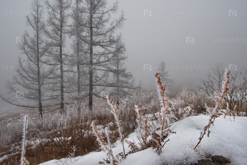 Россия. Горный Алтай. Кусты, покрытые инеем ранним весенним утром на перевале Кату-Ярык с видом на долину реки Чулышман