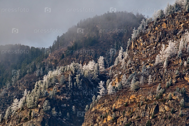 Россия. Горный Алтай. Кусты, покрытые инеем ранним весенним утром на перевале Кату-Ярык с видом на долину реки Чулышман