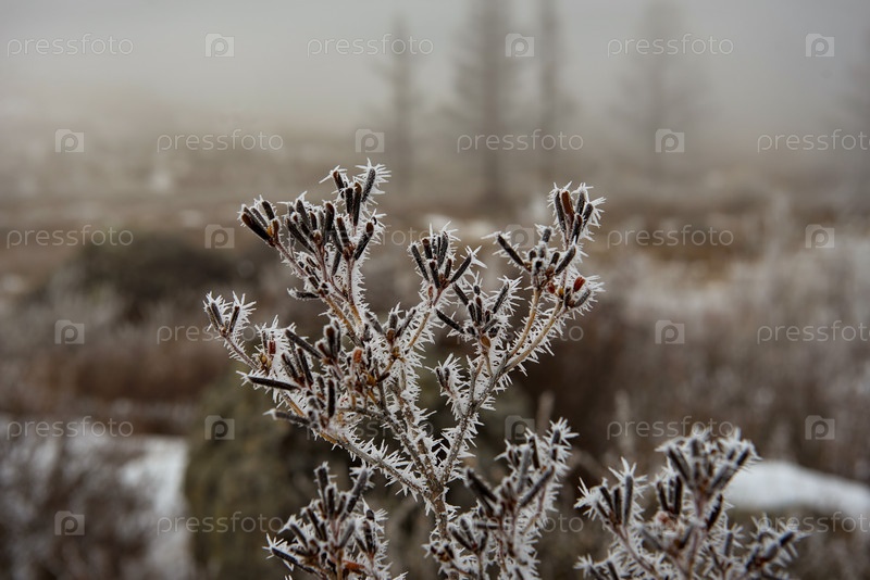 Россия. Горный Алтай. Кусты, покрытые инеем ранним весенним утром на перевале Кату-Ярык с видом на долину реки Чулышман