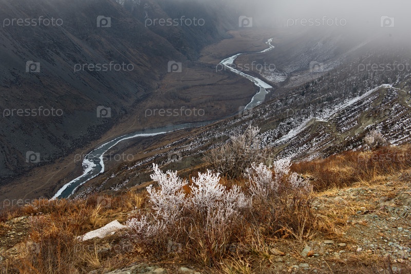 Россия. Горный Алтай. Кусты, покрытые инеем ранним весенним утром на перевале Кату-Ярык с видом на долину реки Чулышман