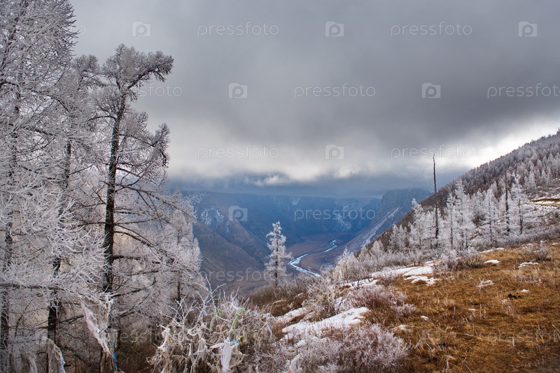 Россия. Горный Алтай. Кусты, покрытые инеем ранним весенним утром на перевале Кату-Ярык с видом на долину реки Чулышман