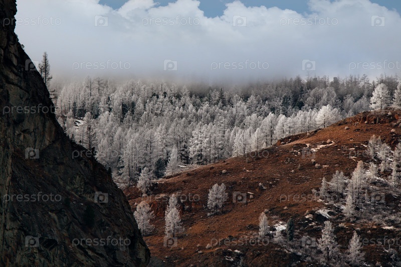 Россия. Горный Алтай. Кусты, покрытые инеем ранним весенним утром на перевале Кату-Ярык с видом на долину реки Чулышман