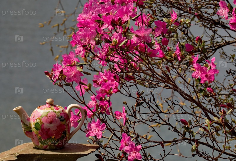 Россия. Горный Алтай. Керамический чайник с цветами маральника (рододендрон) в окружении цветущего маральника