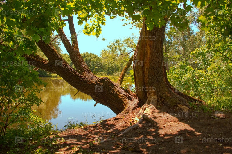 Две больших дерева на берегу пруда