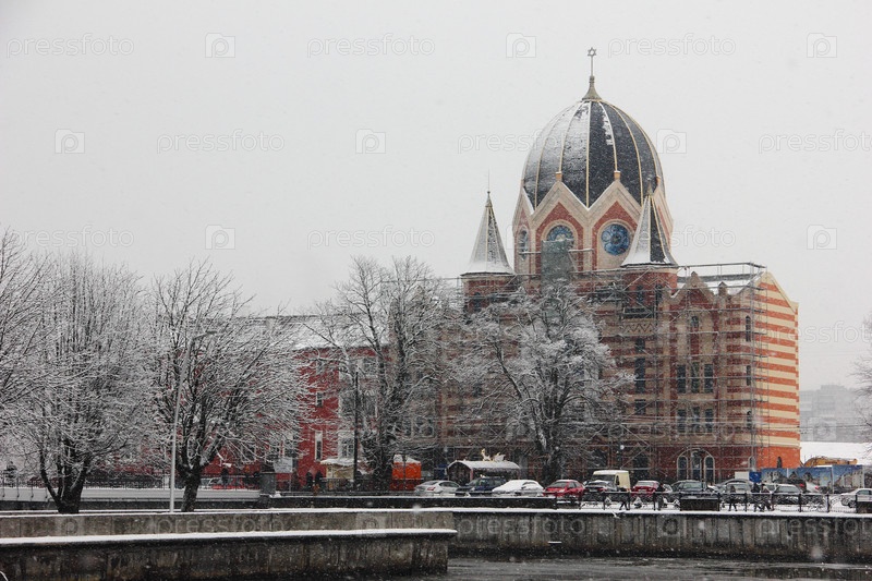 Зимний пейзаж. Окончание строительства Синагоги в городе Калининграде, здание со строительными лесами (2018 год)