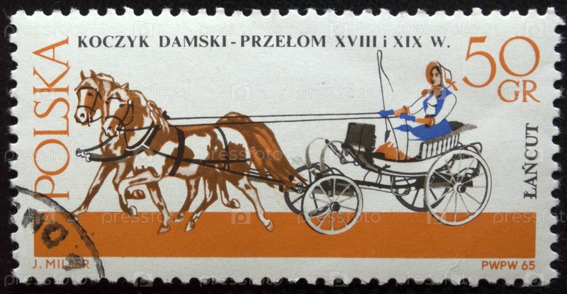 Почтовая марка с гашением Польша 1965 год. Конные экипажи. Музей Ланкута. Дамская корзинка