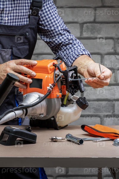 Техник, мужчина в форме ремонтирует бензиновую косилку на верстаке. Малый бизнес