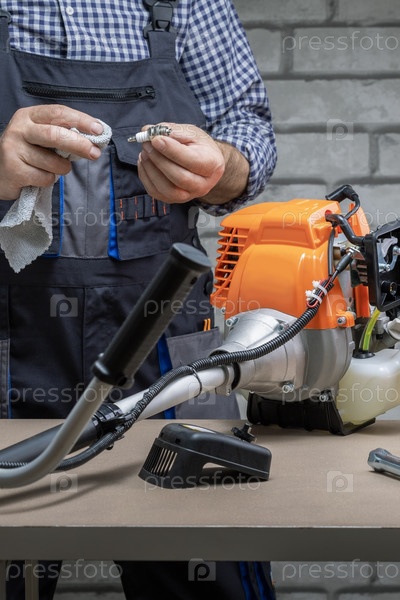 Мужчина, техник проверяет, ремонт бензиновой косилки, бензинового триммера