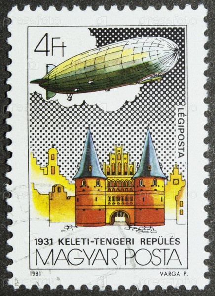 Почтовая марка с гашением Венгрия 1981 год. Девятиарочный мост, Хортобадь. Дирижабли (цеппелины)