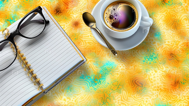Чашка кофе, цветы, ручка и бумага на деревянном столе. Поздравительная цветочная открытка