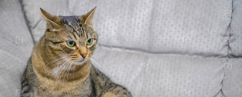 Сонный полосатый кот сидит на диване