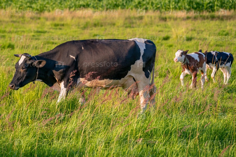 Коровы пасутся на сочном лугу в летний день