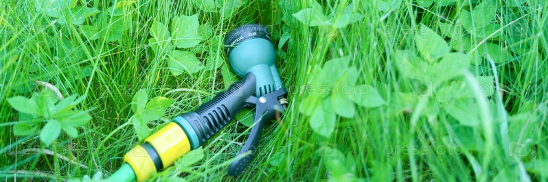 Насадка-разбрызгиватель среди зеленой травы на газоне