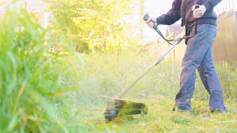 Мужчина косит траву триммером, фокусируется на размытом фоне переднего плана
