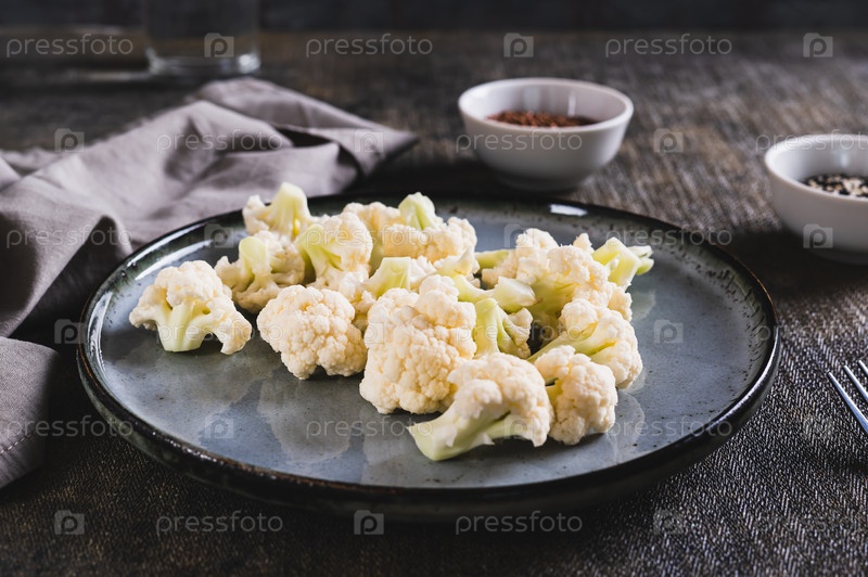 Кусочки сырой цветной капусты для диеты на тарелке на столе