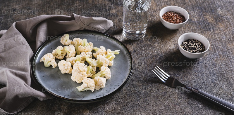 Кусочки сырой цветной капусты для диеты на тарелке на столе веб-баннер