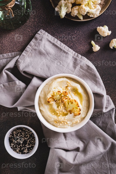 Вегетарианское диетическое пюре из цветной капусты в миске на столе и вертикальный вид