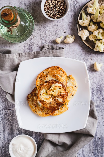 Домашние оладьи из цветной капусты на тарелке и сметана в миске на столе и вертикальный вид