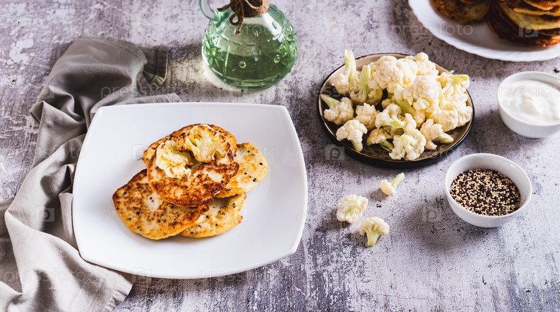 Пряные вегетарианские оладьи из цветной капусты на тарелке на столе веб-баннер