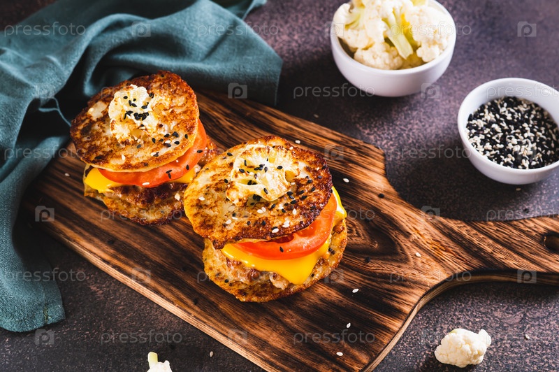 Домашние кето-бургеры на оладьях из цветной капусты на доске