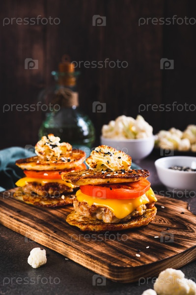 Кето-бургеры на оладьях из цветной капусты с котлетой, помидорами и сыром на доске, вертикальный вид