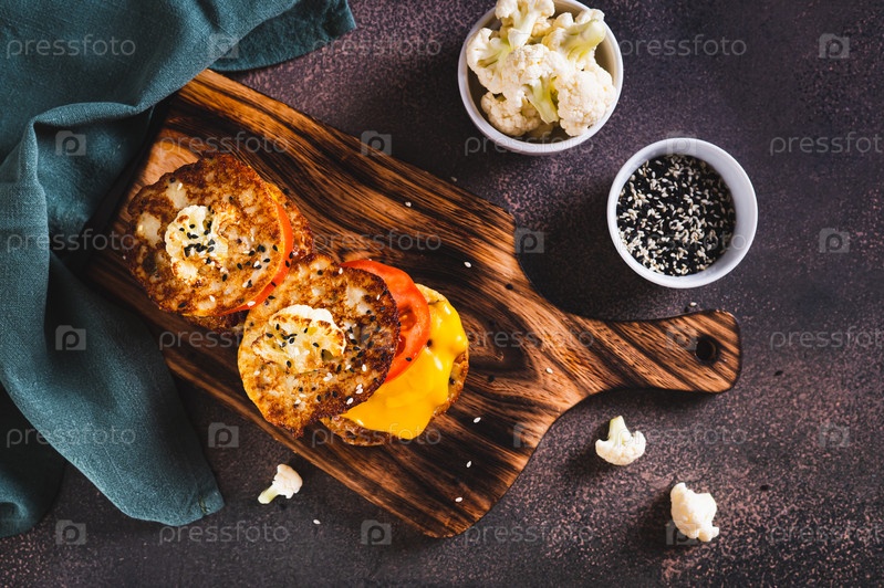 Кето-бургеры на оладьях из цветной капусты с котлетой, помидорами и сыром на доске, вид сверху