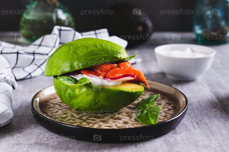 Кето-бургер из авокадо, йогурта, красной рыбы и редиса на тарелке на столе