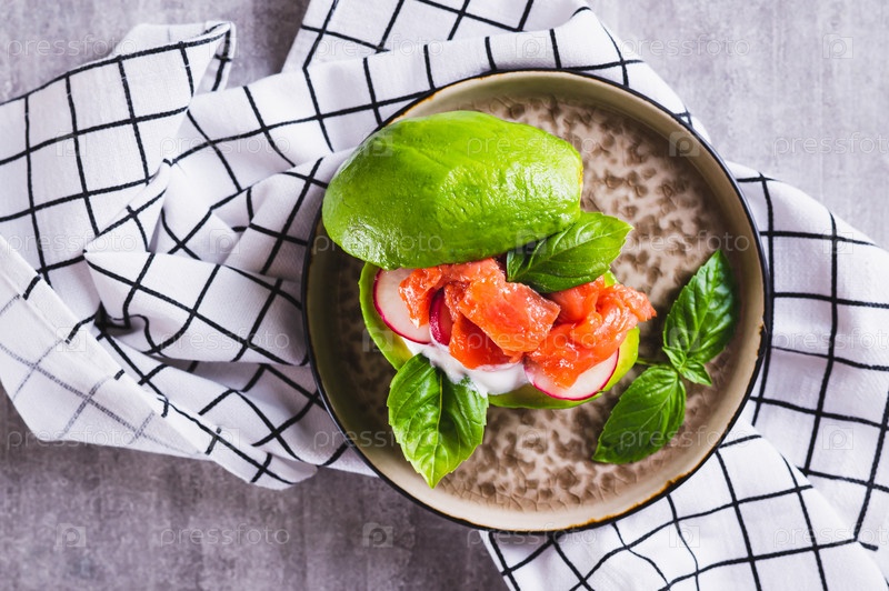 Крупный план кето-бургера из авокадо, йогурта, красной рыбы и редиса на тарелке сверху