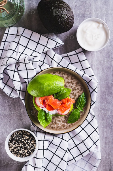 Кето-бургер из авокадо с красной рыбой, редисом и соусом на тарелке на столе и вертикальный вид