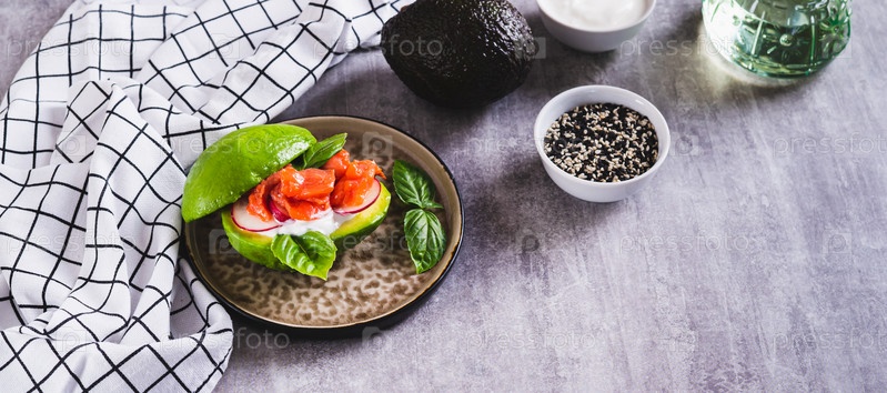 Кето-бургер из авокадо, йогурта, красной рыбы и редиса на тарелке на веб-баннере стола