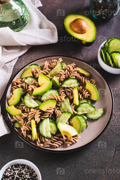 Гречневая паста без глютена, огурец и авокадо на тарелке на столе, вертикальный вид