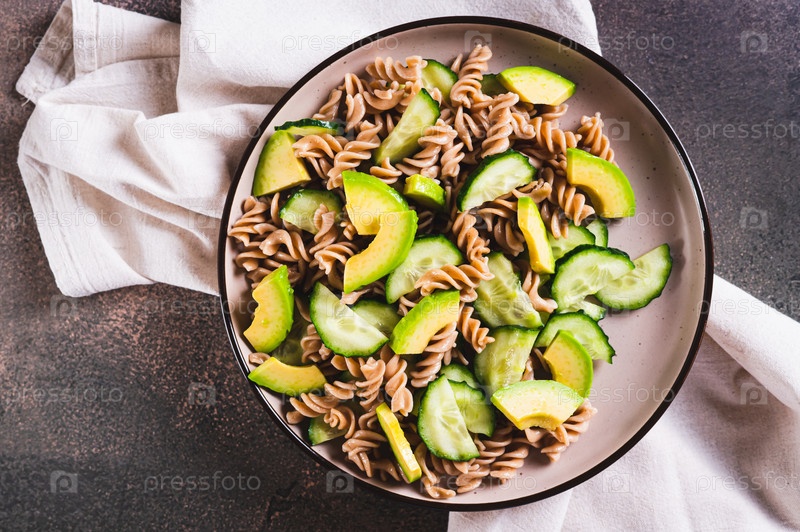 Крупным планом вкусный салат из гречневой пасты, огурца и авокадо на тарелке сверху