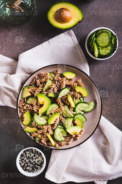 Гречневая паста без глютена, огурец и авокадо на тарелке на столе и вертикальный вид