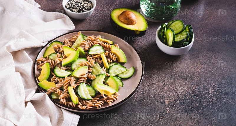 Вкусный салат из гречневой пасты, огурца и авокадо на тарелке веб-баннера