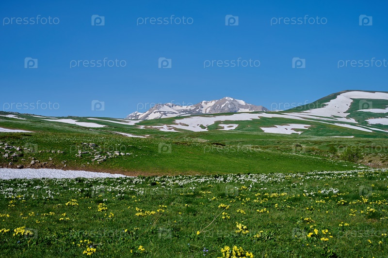 Горное плато, снежный горный пейзаж и цветущая земля