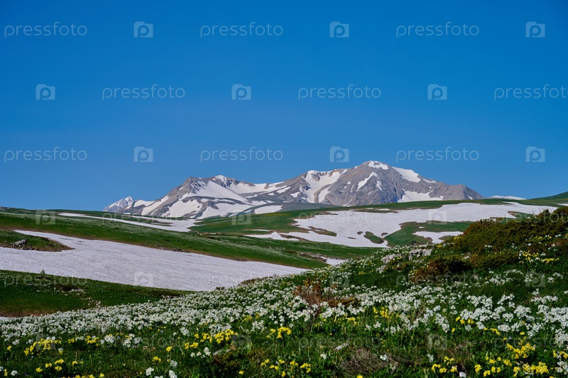 Горное плато, снежный горный пейзаж и цветущая земля
