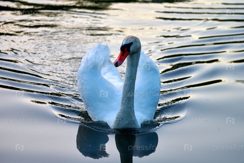 Изящный белый лебедь плывет, создавая рябь на спокойной воде с безмятежными отражениями в солнечный день
