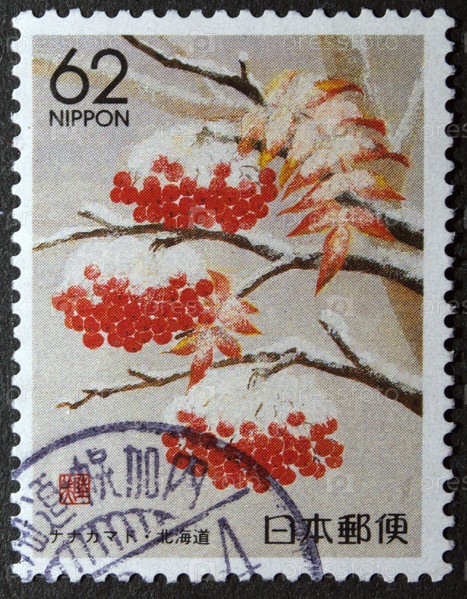 Почтовая марка с гашением Япония 1998 год. Ягоды рябины на снегу