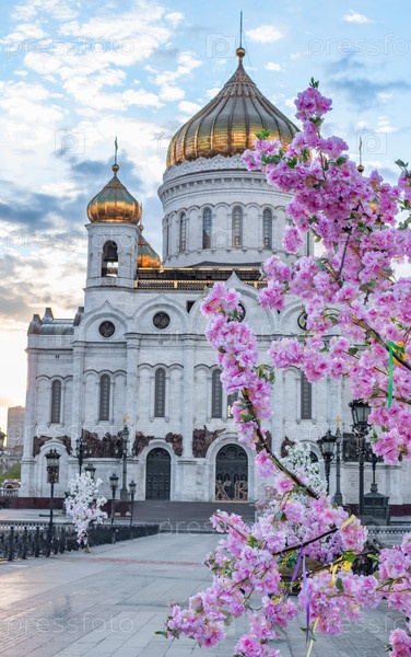 Храм Христа Спасителя в весенних цветущих деревьях