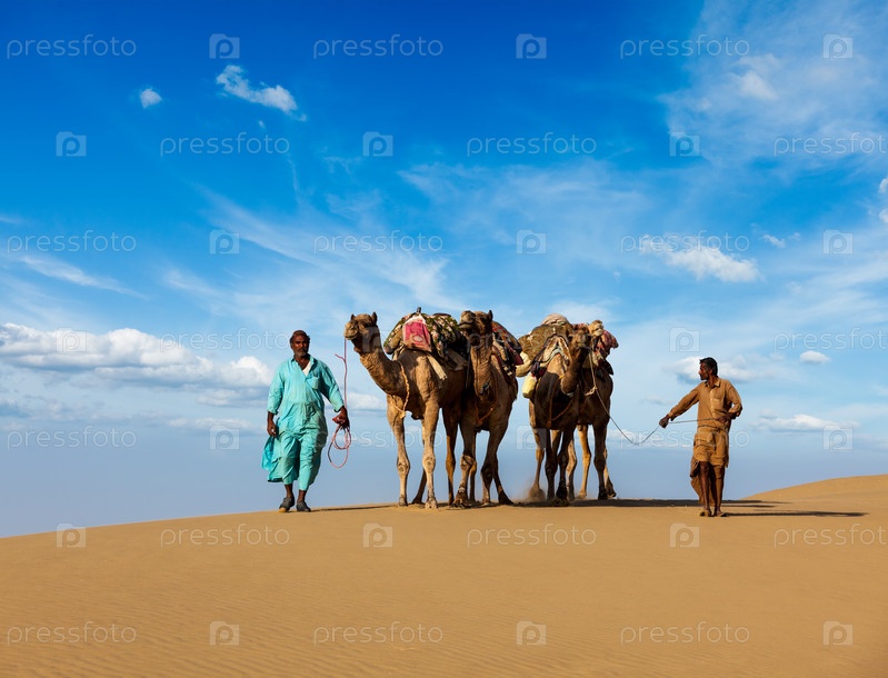 Два погонщика (погонщики верблюдов) с верблюдами в дюнах Тар-Дезера