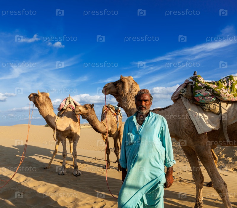 Камелеер (гонщик верблюдов) с верблюдами в дюнах пустыни Тар
