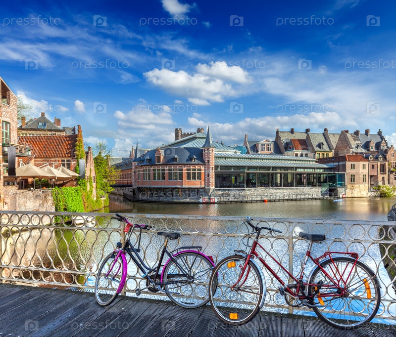 Мост, велосипеды и канал. Гент, Бельгия