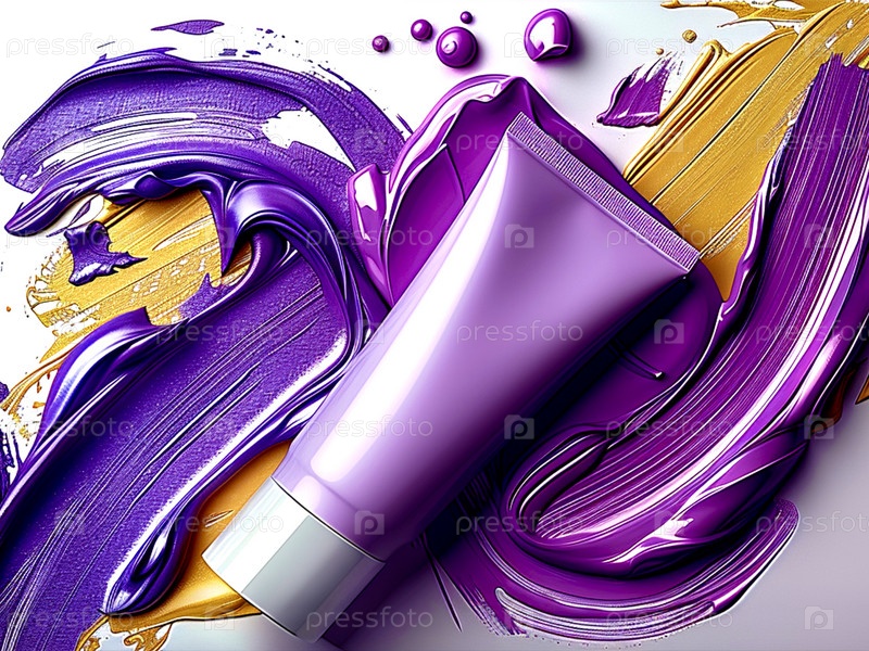 Волнистые абстрактные мазки синей, фиолетовой и желтой краски, на которых лежит сиреневая трубка с копировальным пространством