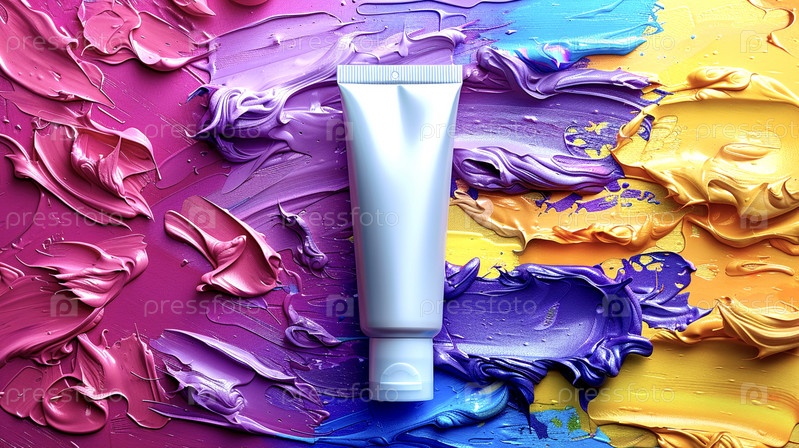 На разноцветном абстрактном фоне желтых, синих, фиолетовых и красных мазков находится серая трубка с пустым местом для текста