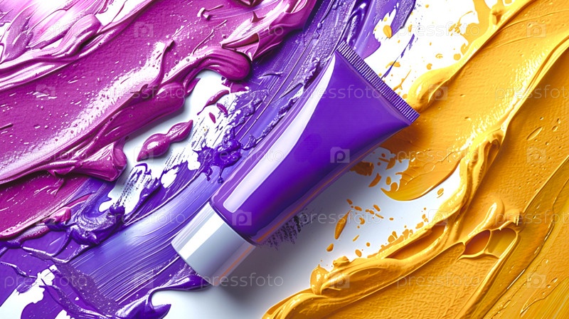 Среди розовых, фиолетовых и желтых мазков краски лежит фиолетовая трубка с местом для копирования