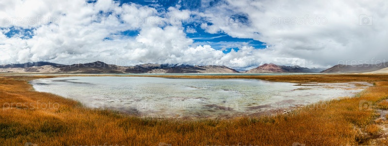 Панорама Цо Кар - колеблющегося соленого озера в Гималаях. Рапшу, Ладакх, Джамму и Кашмир, Индия