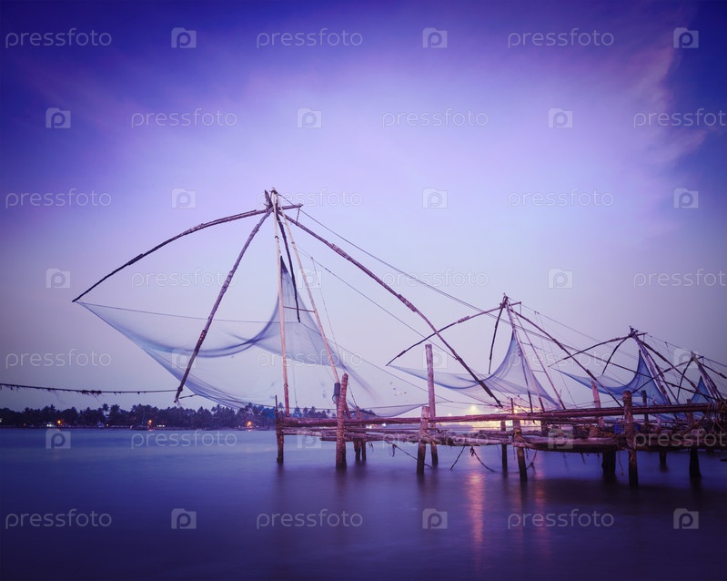 Китайские рыболовные сети на закате. Кочи, Керала, Индия