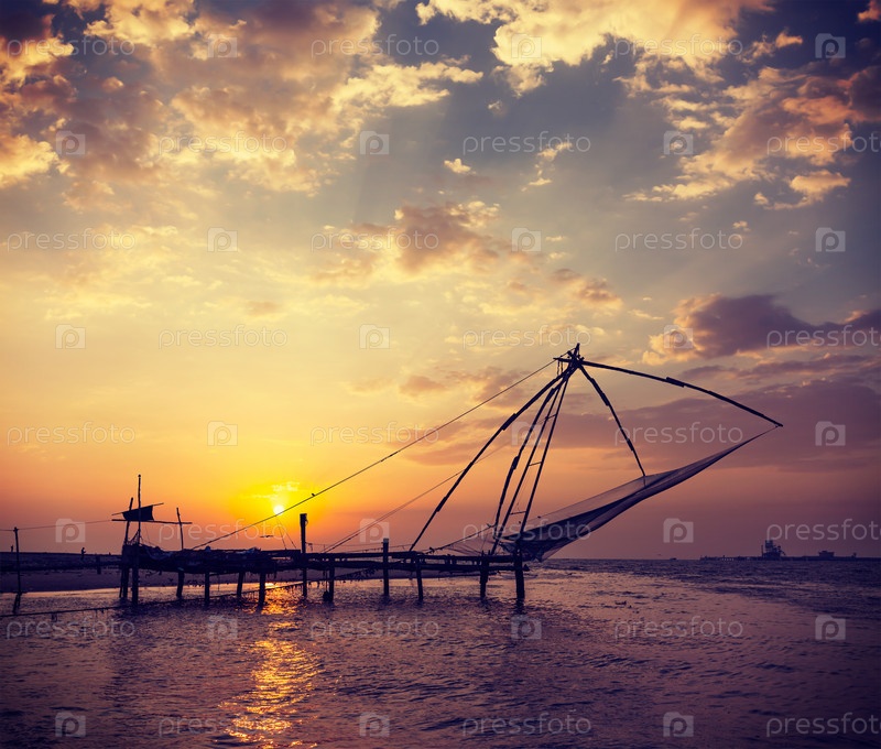 Китайские рыболовные сети на закате. Кочи, Керала, Индия