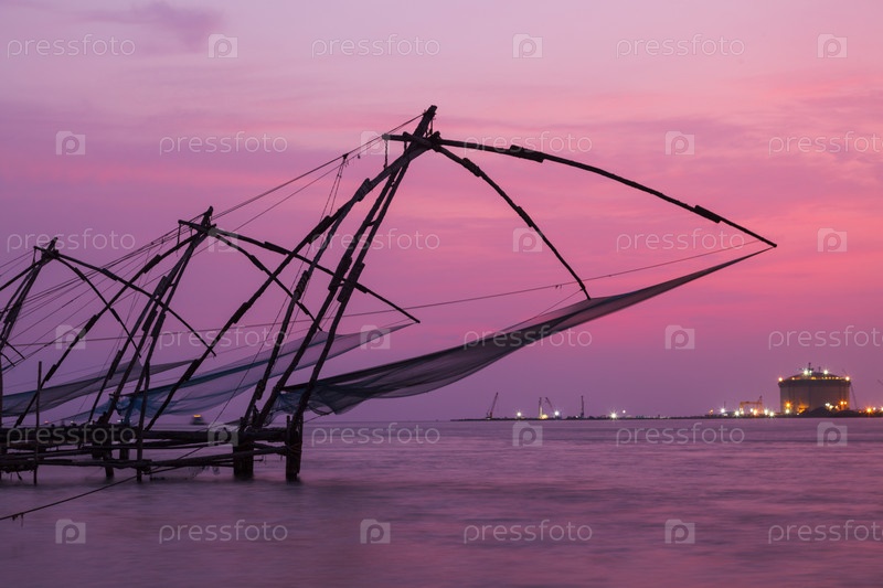 Китайские рыболовные сети на закате. Кочи, Керала, Индия